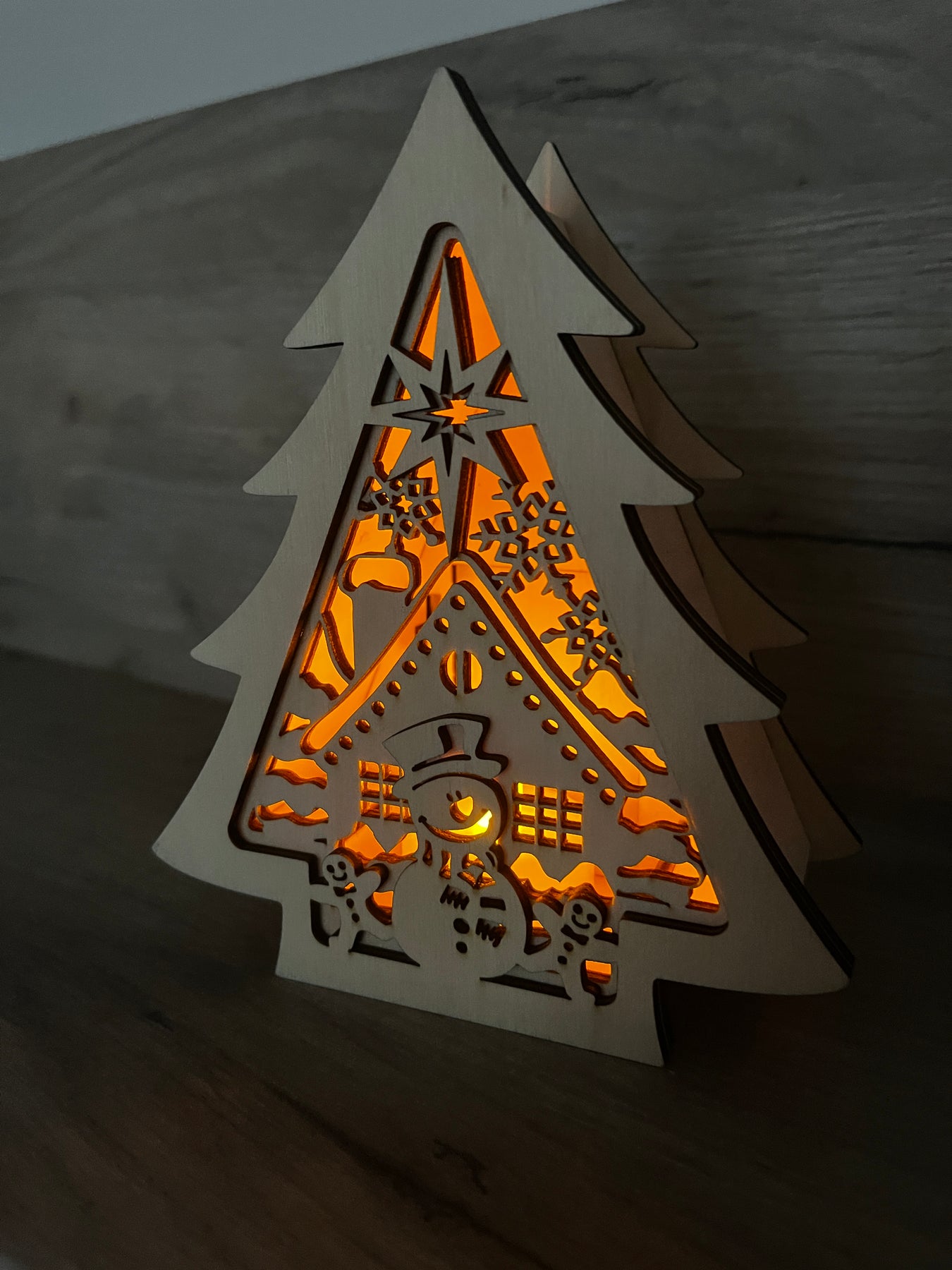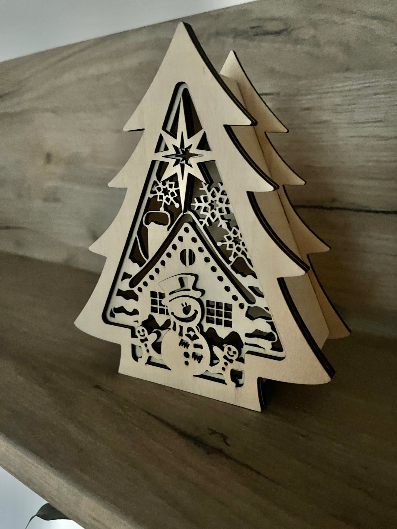 Ta prikupna lesena smrečica skriva celo mini svet – toplo osvetljeno hiško, igrive snežake in drobne praznične detajle. V prostoru takoj ustvari veselo, čarobno atmosfero, kot bi odprli vrata v mali božični kraj. Idealna za mizo, polico ali kot posebno praznično darilo.