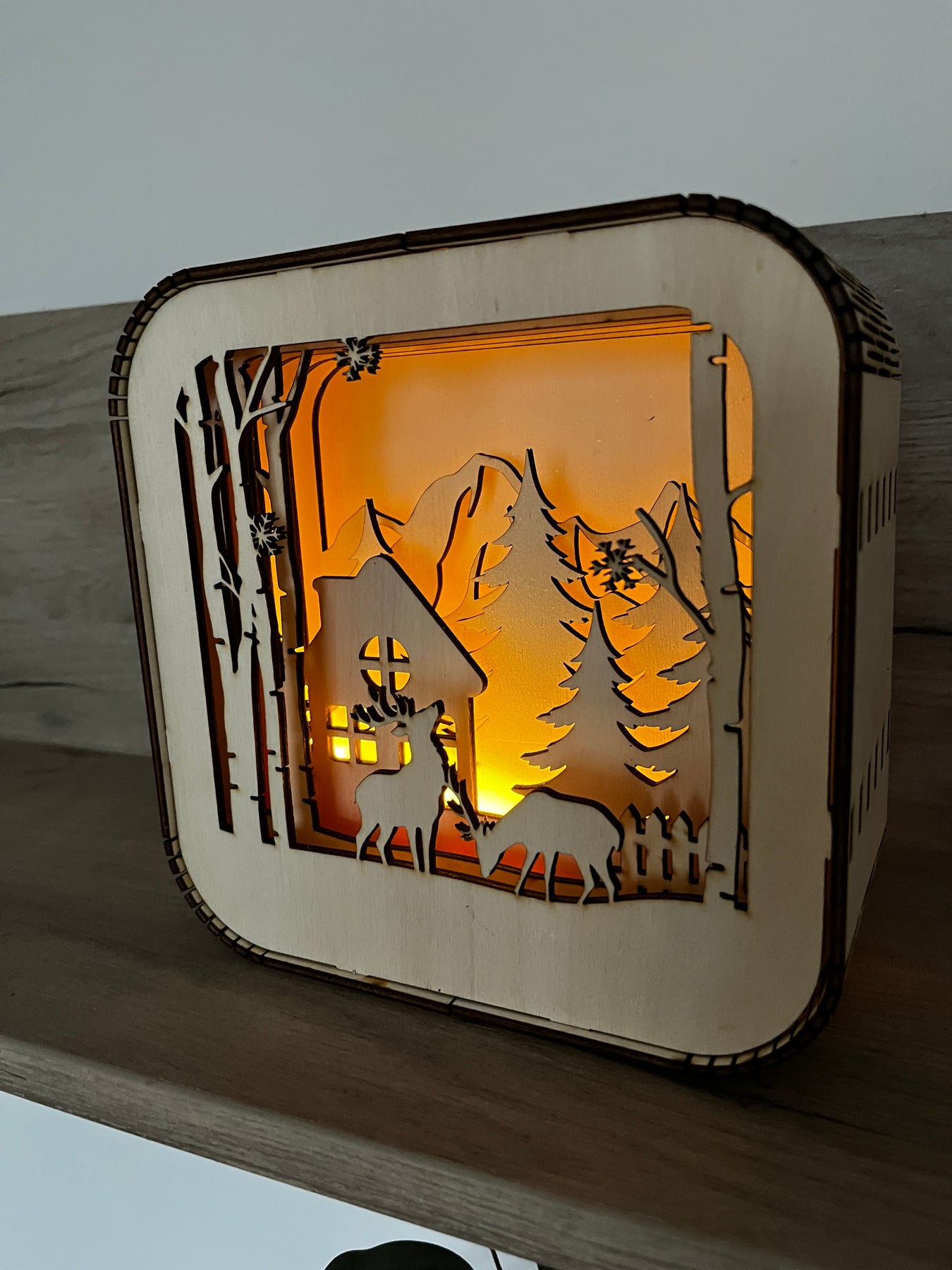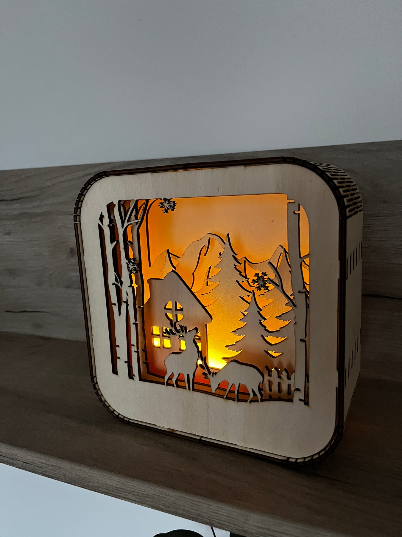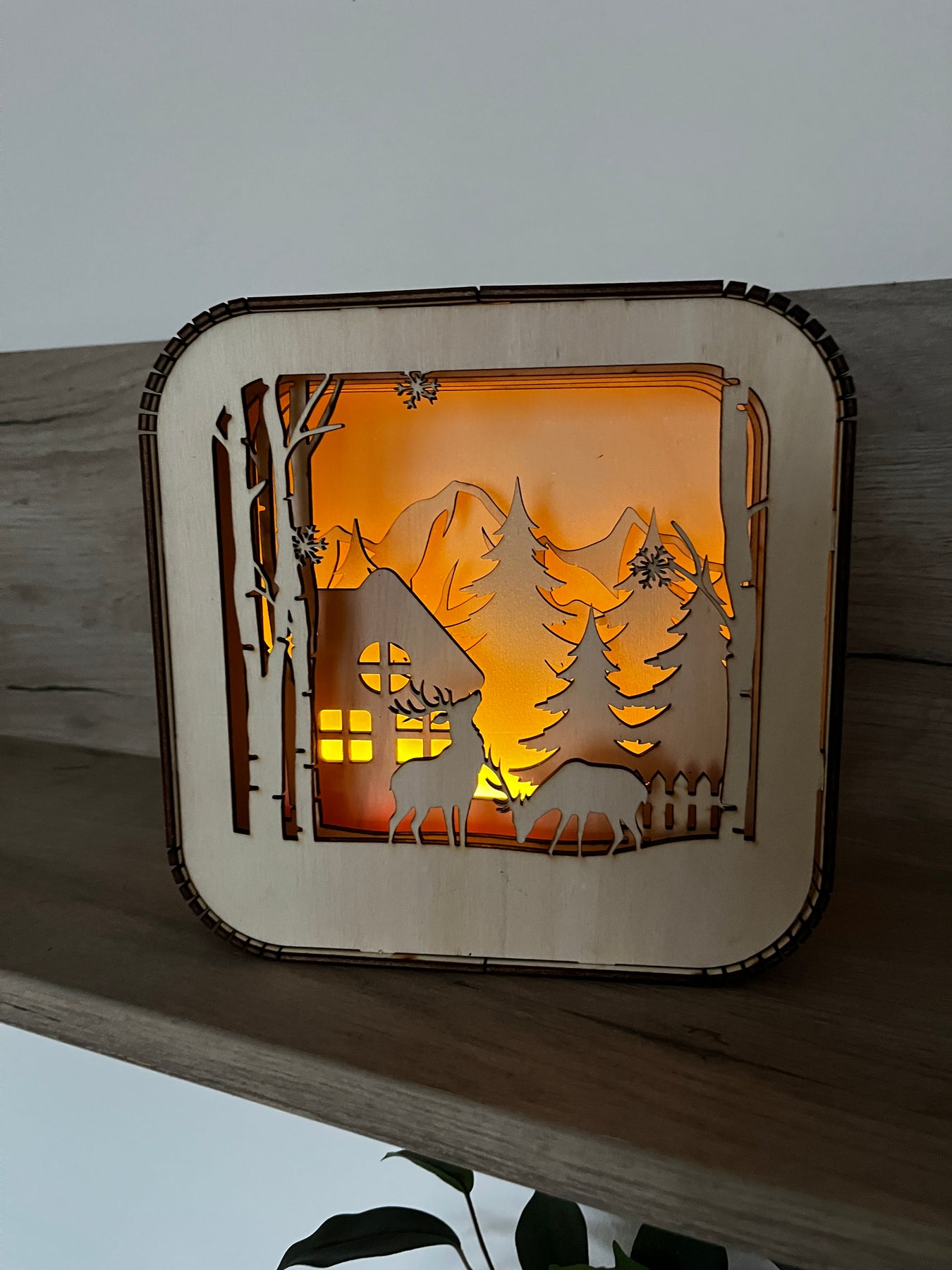 Topla, pravljična in čarobna – ta unikatna lesena 3D svetilka ustvari občutek domačnosti takoj, ko zasveti. Večplastni izrezani motivi gozdnih dreves, jelenčkov in zasnežene hiške ustvarijo globino in gibanje, kot bi gledali skozi okno v majhen zimski svet. Mehka rumena svetloba LED lučke poskrbi, da prizor nežno zaživi in prostoru doda prijetno toplino.