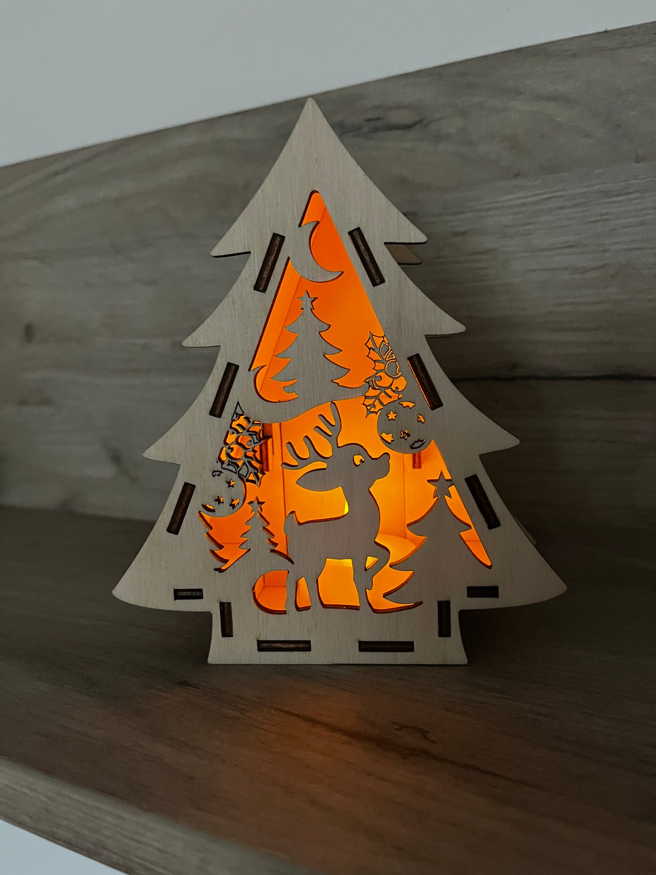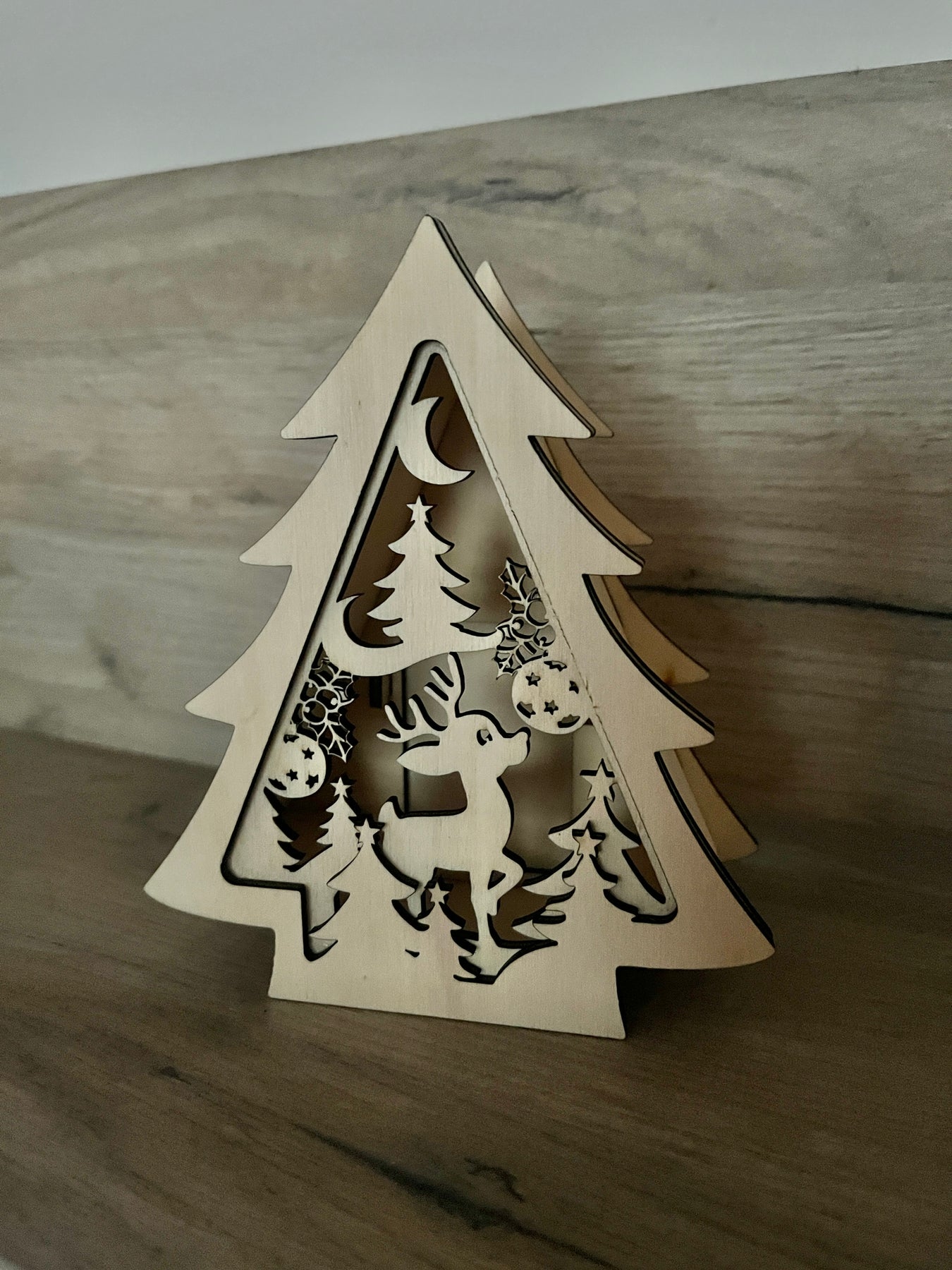 Nežna lesena smrečica z drobnim jelenčkom v osrčju pravljice pričara občutek topline in miru. Njeni izrezani detajli ustvarijo prijetno globino, kot bi opazovali tih zimski gozd pod mesečino. Popolna je za praznični kotiček, kjer želite pridih nežnosti in domačnosti.