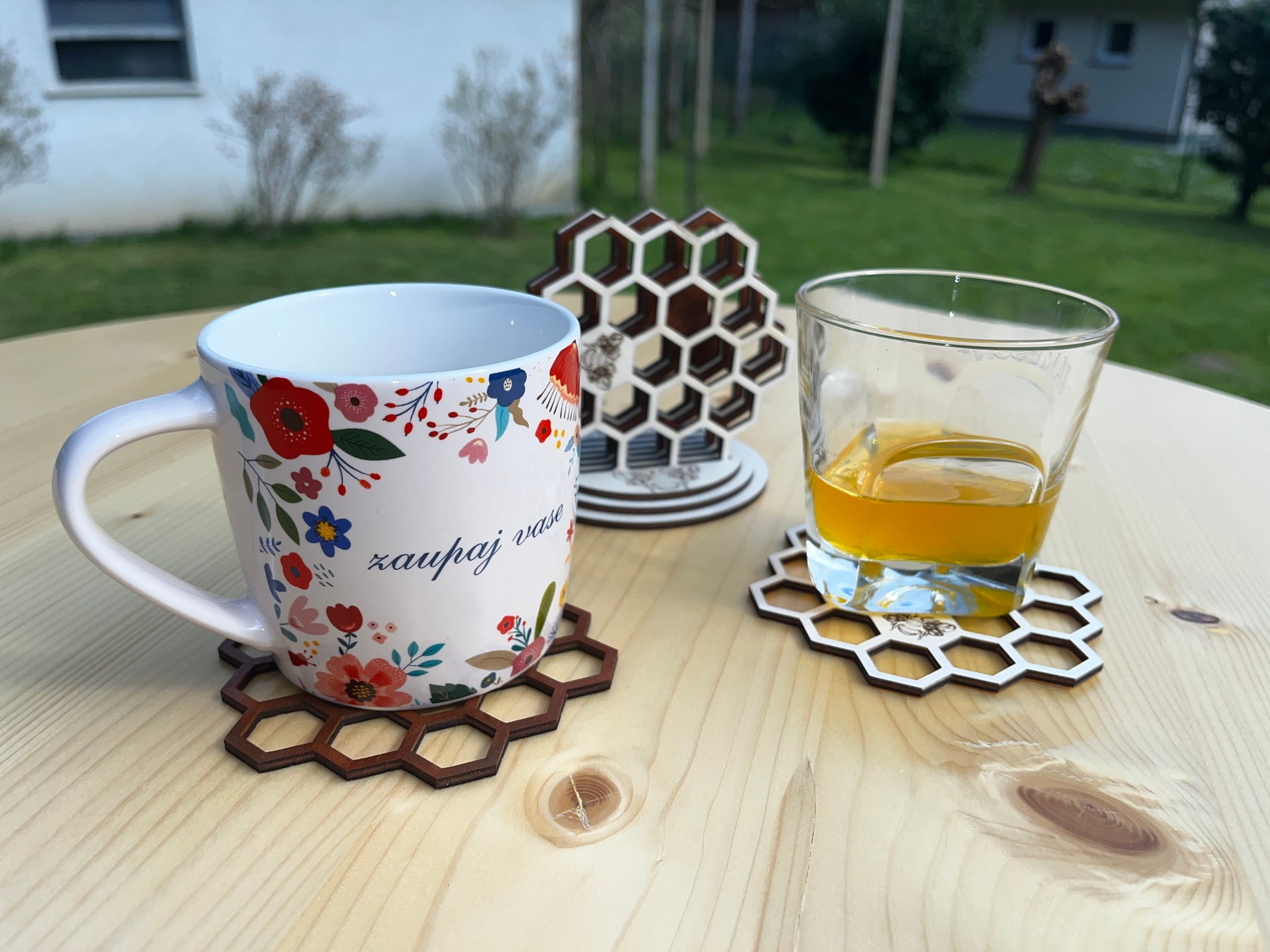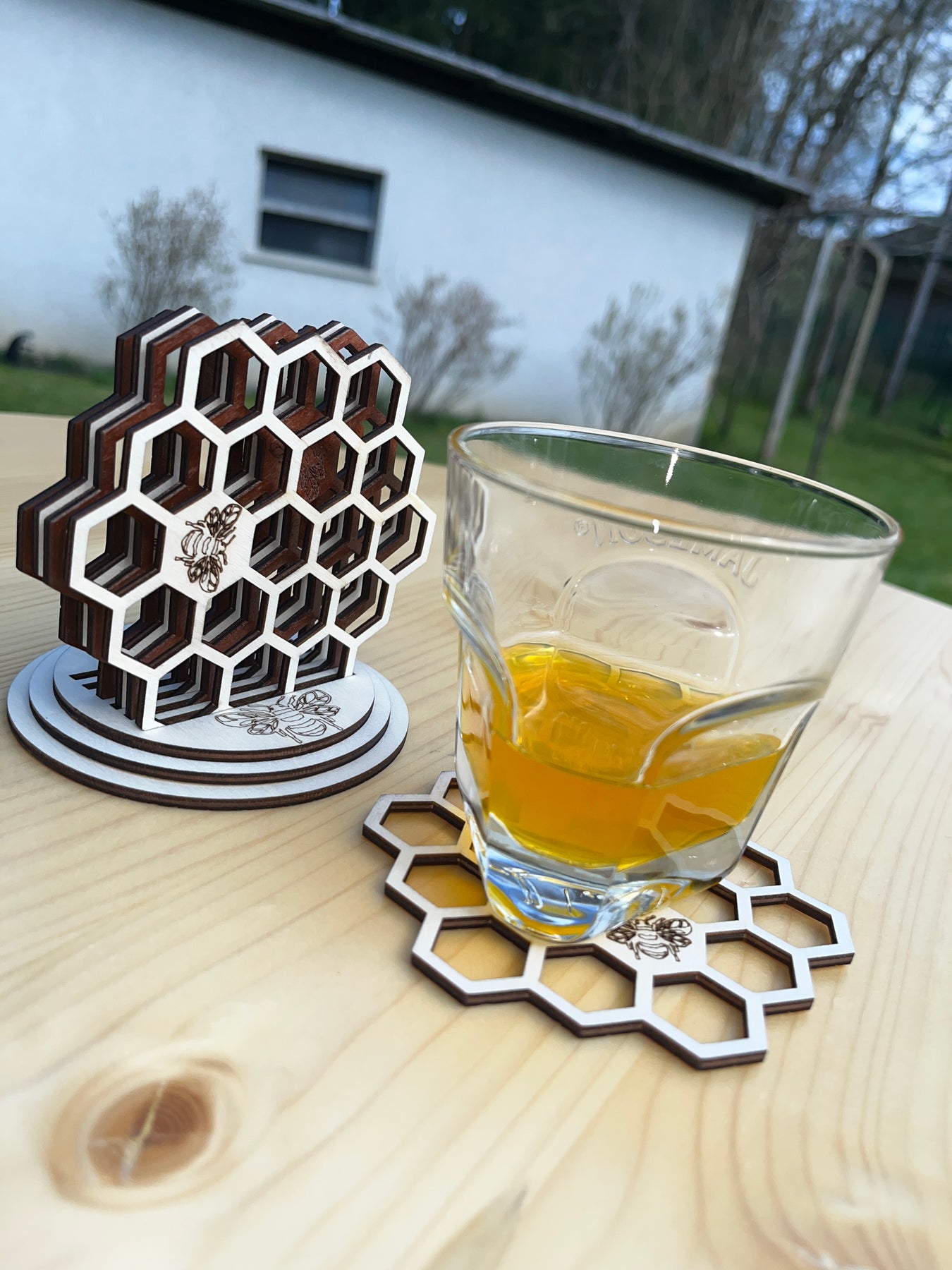 Komplet šestih unikatnih podstavkov za kozarce v obliki čebeljega satja (satovja). Lasersko rezan vzorec daje vsakemu kosu čar narave, hkrati pa poskrbi za toplino in eleganco na tvoji mizi.