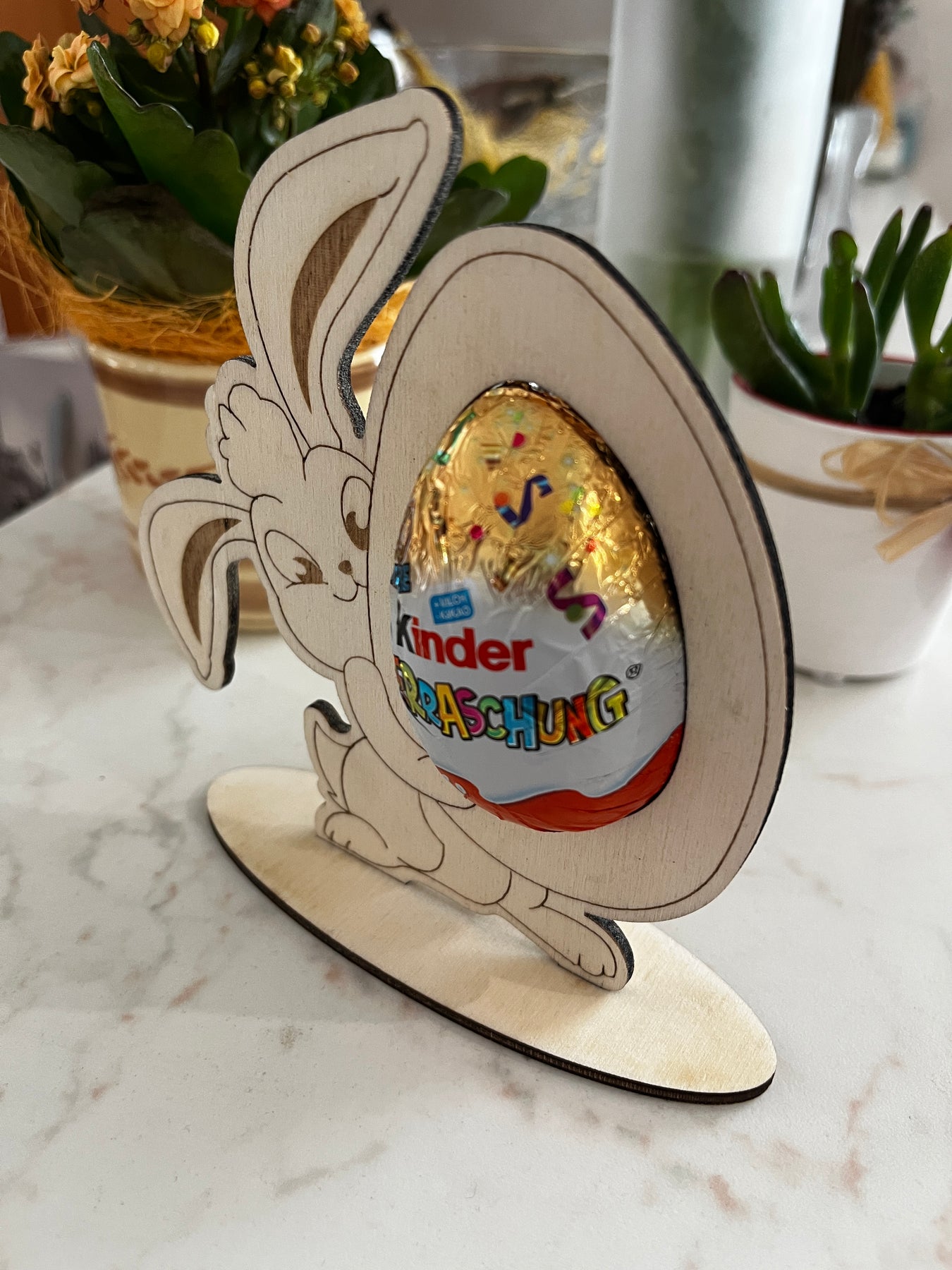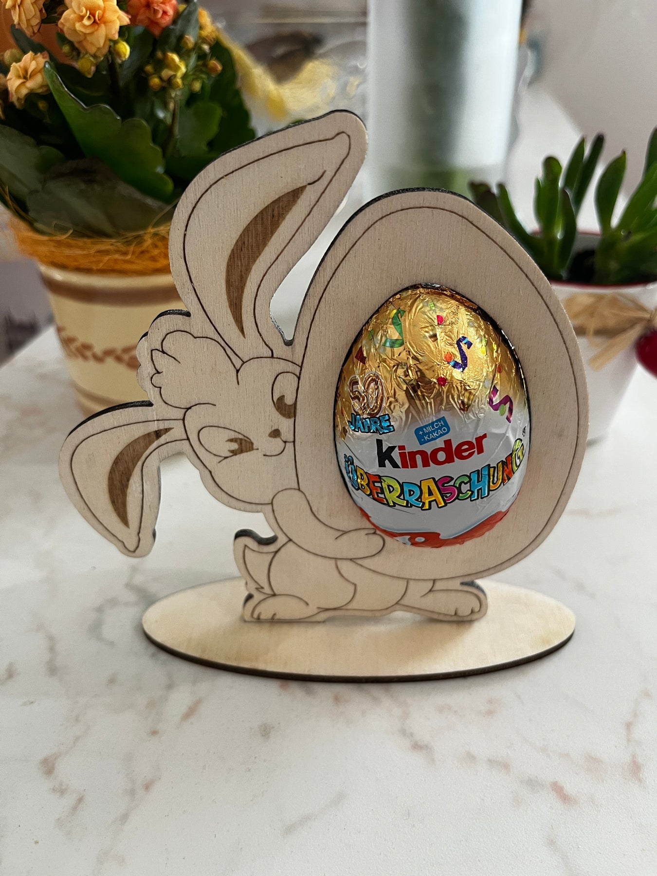 Naš prikupni zajček ki drži jajčko – Kinder presenečenje! Izdelek je zasnovan kot izvirna praznična dekoracija ali darilo, ki bo navdušilo otroke in odrasle.