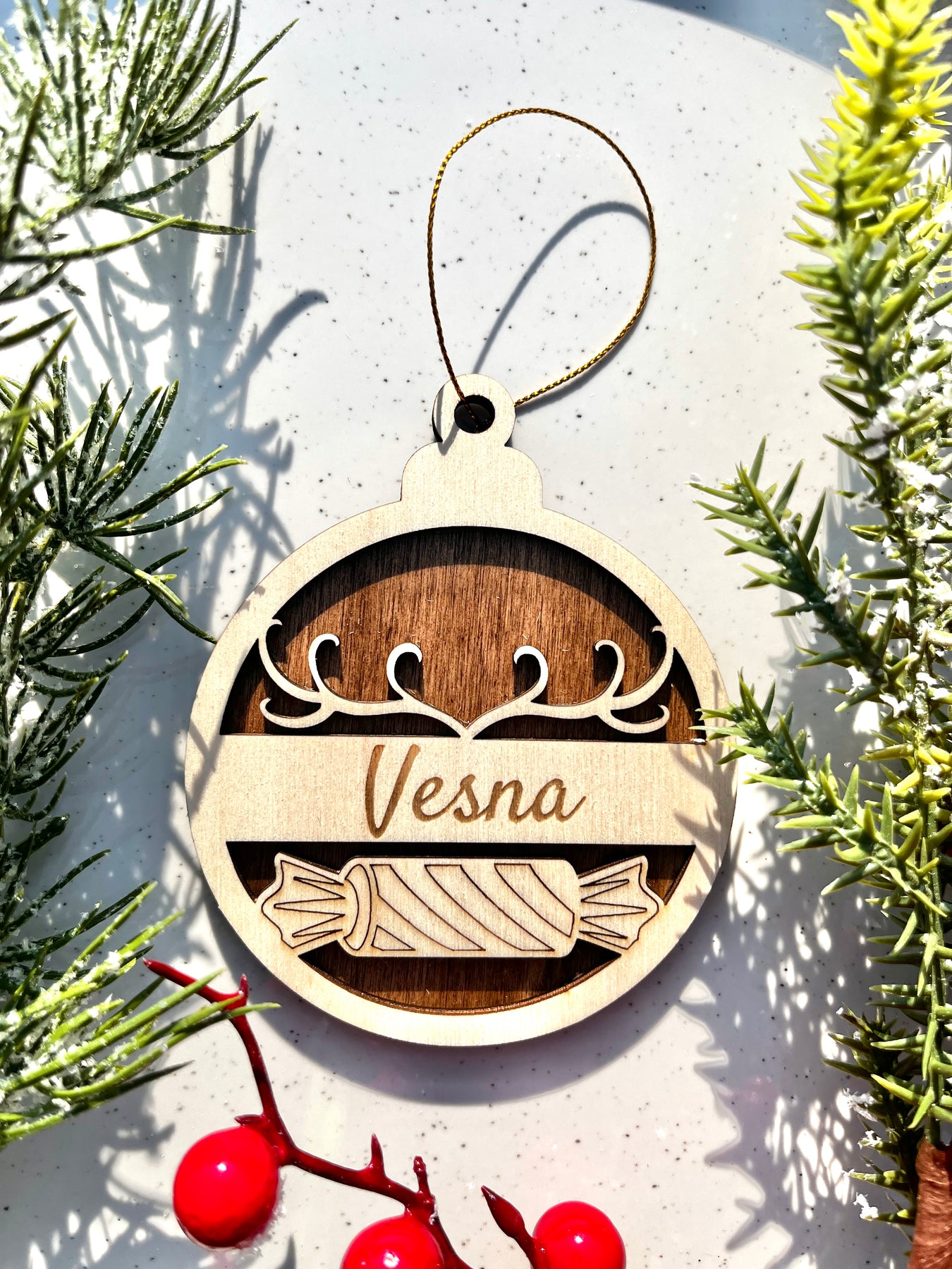 Prikupna lesena božična kroglica, ustvarjena iz toplega naravnega lesa, prinaša v dom praznično čarobnost in osebni pridih. Vsak okrasek je natančno lasersko izrezan, skrbno graviran in izdelan tako, da ujeti drobne detajle, ki ustvarijo popoln božični motiv – od snežink do jelenčkov in prazničnih simbolov.
