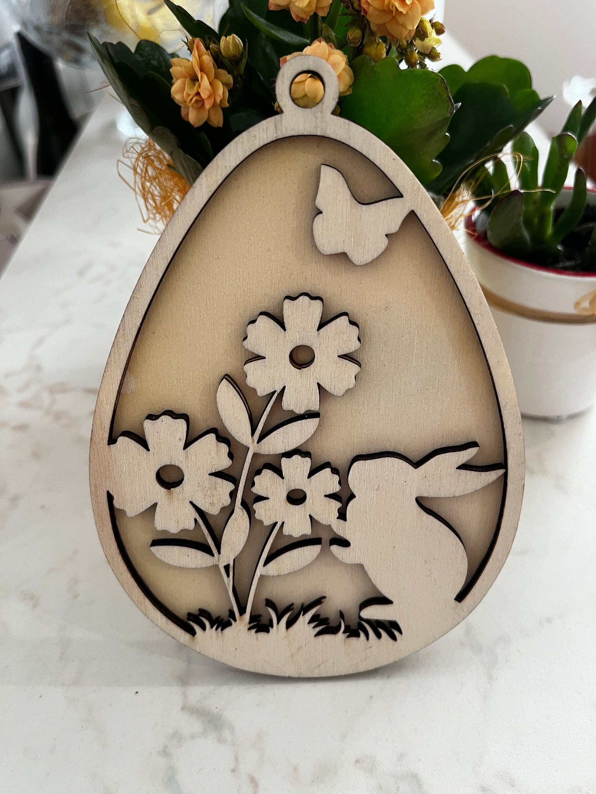Prikupen zajček, skrit v jajčku, je popoln dodatek za tvoja vhodna vrata, notranji prostor ali kot darilo ob praznikih. Vsak obesek je natančno izrezan z laserjem in ročno dodelan – z veliko pozornosti in, seveda, z ljubeznijo.