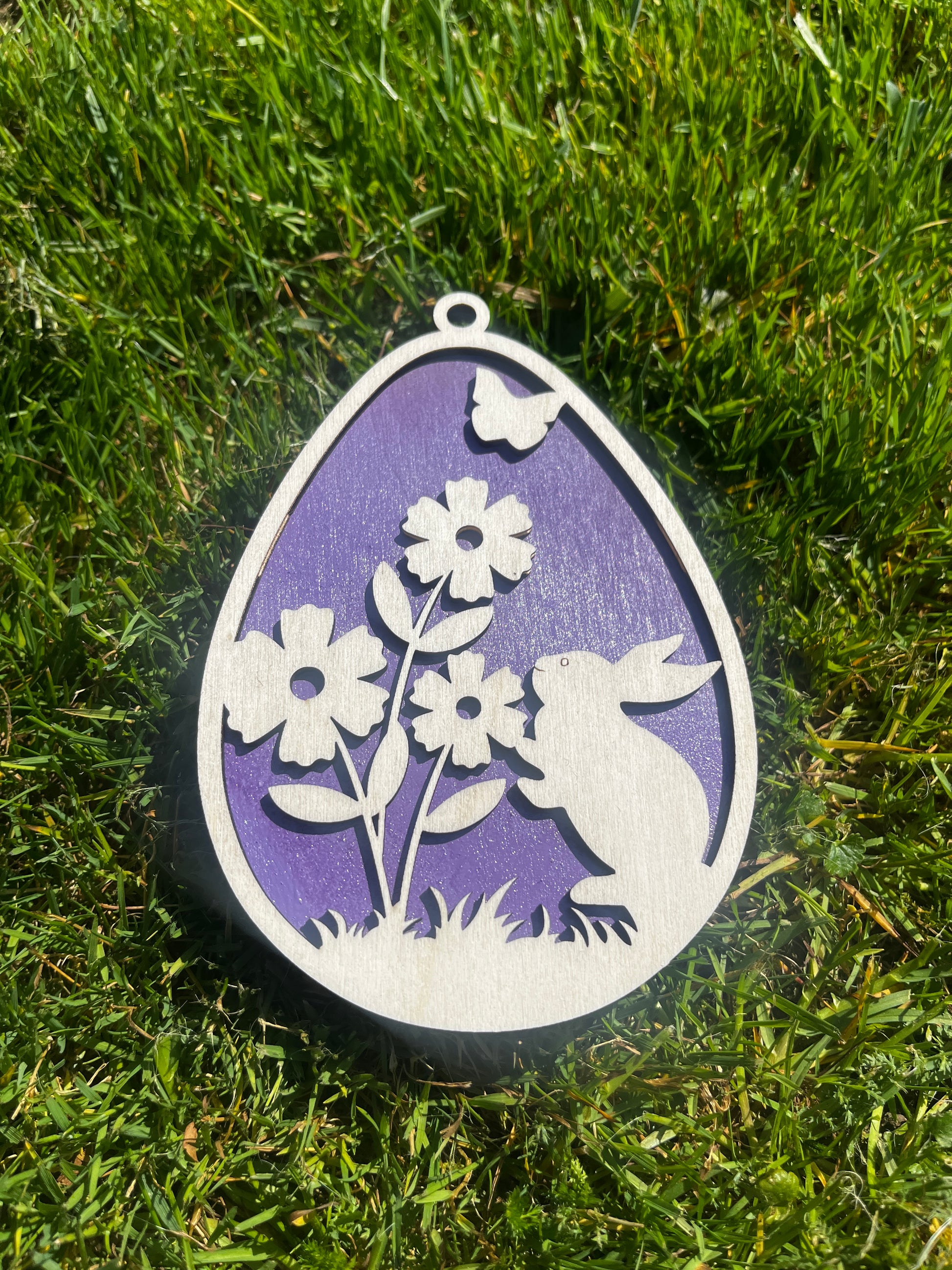 Prikupen zajček, skrit v vijoličnem jajčku, je popoln dodatek za tvoja vhodna vrata, notranji prostor ali kot darilo ob praznikih. Vsak obesek je natančno izrezan z laserjem in ročno dodelan – z veliko pozornosti in, seveda, z ljubeznijo.